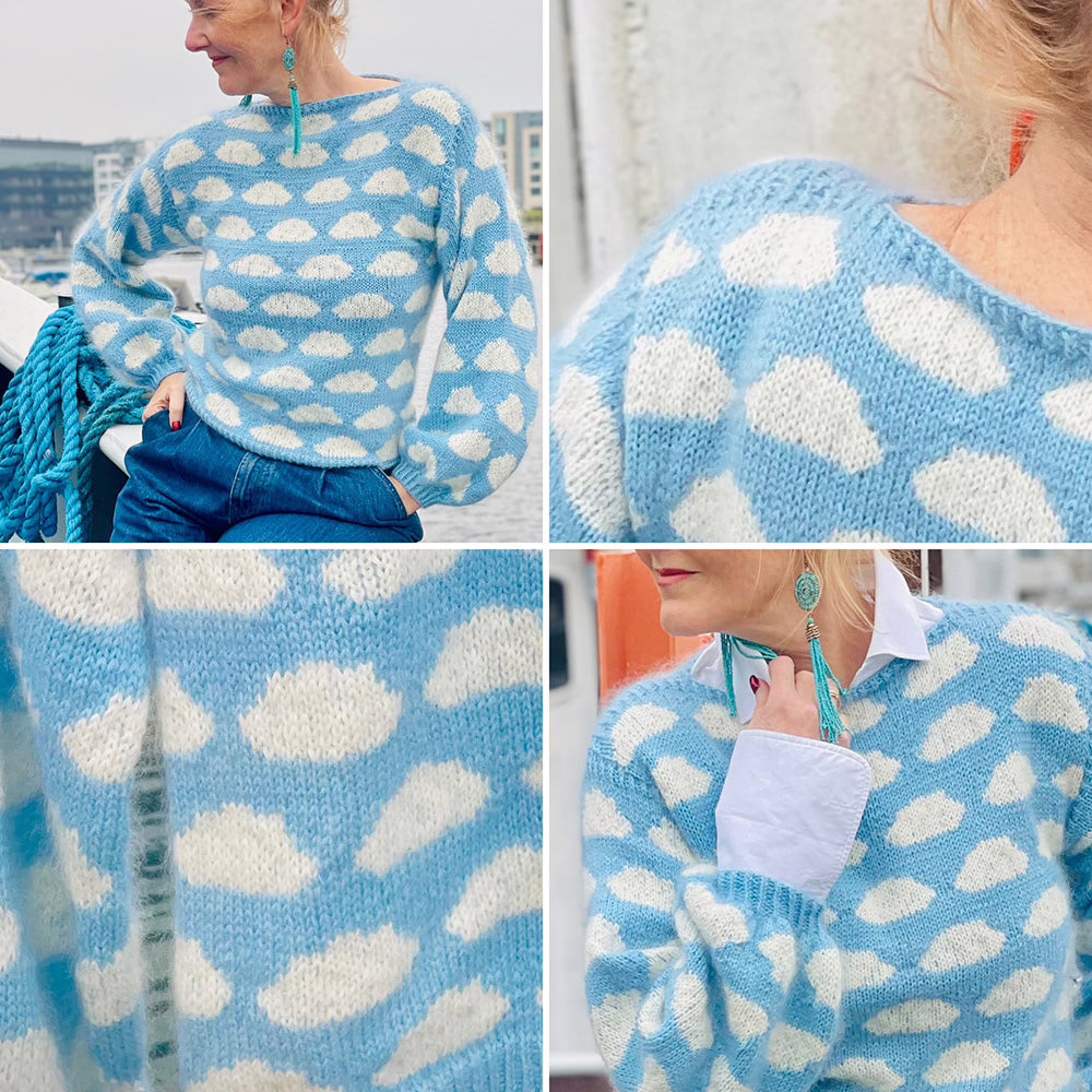 I vilden sky strikkes nedefra og op. Ærmemaskerne samles op i ærmegab og det hele strikkes i det fineste mønsterstrik. Så det er vigtigt at have tungen lige i munden.