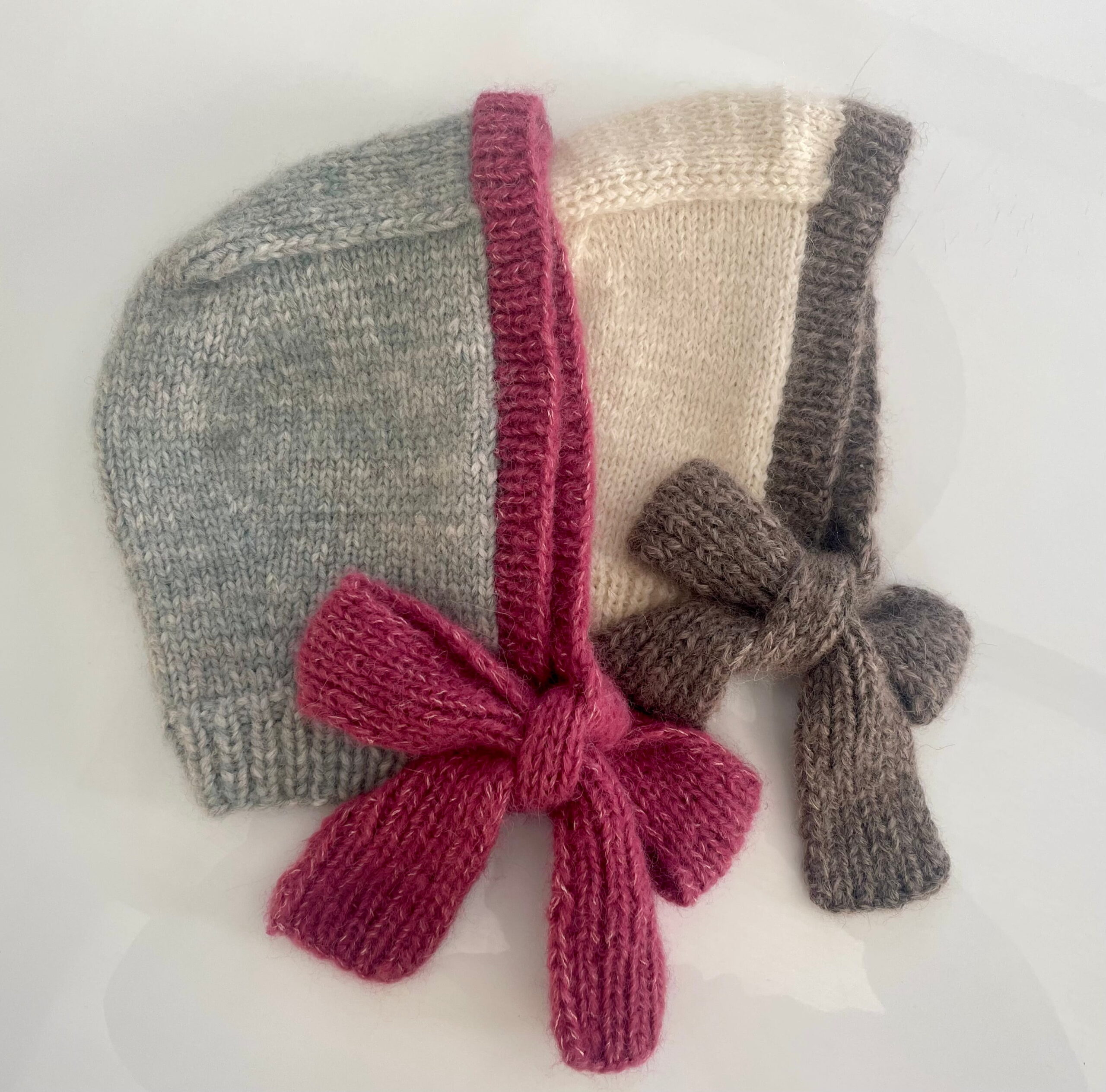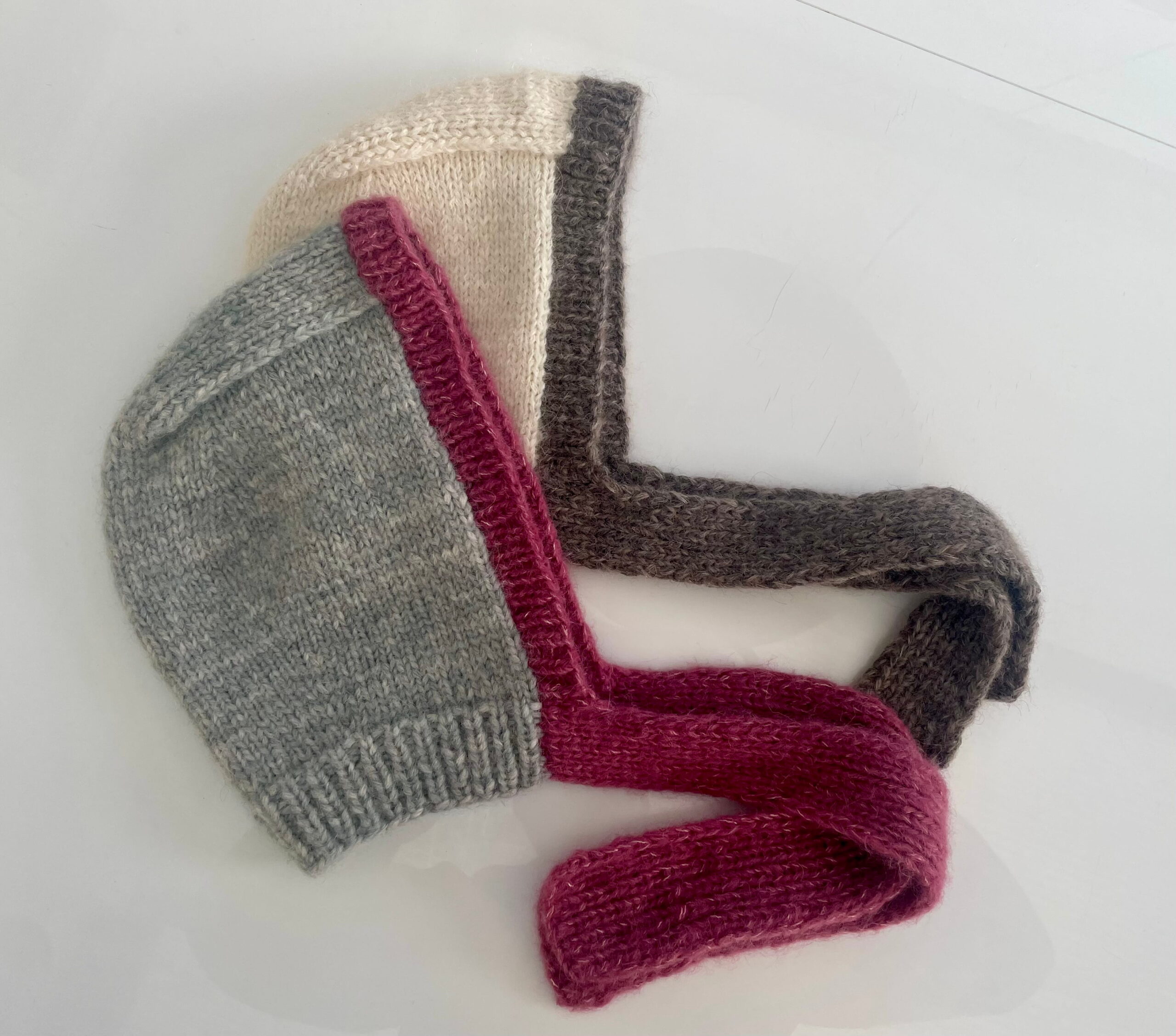 Strik evt. i en grundfarve på selve hætten og en kontrastfarve på ribkant og bindebånd. (Så skal du bruge 1 nøgle af hver kvalitet i hver farve.)