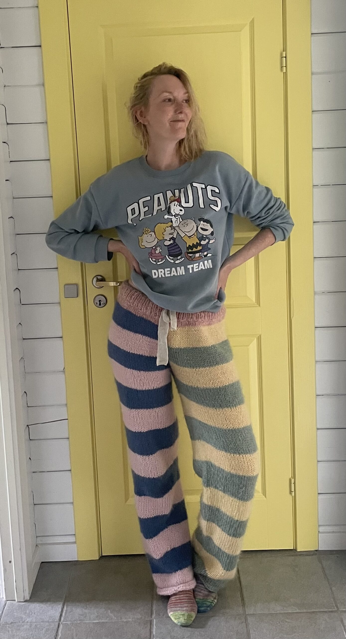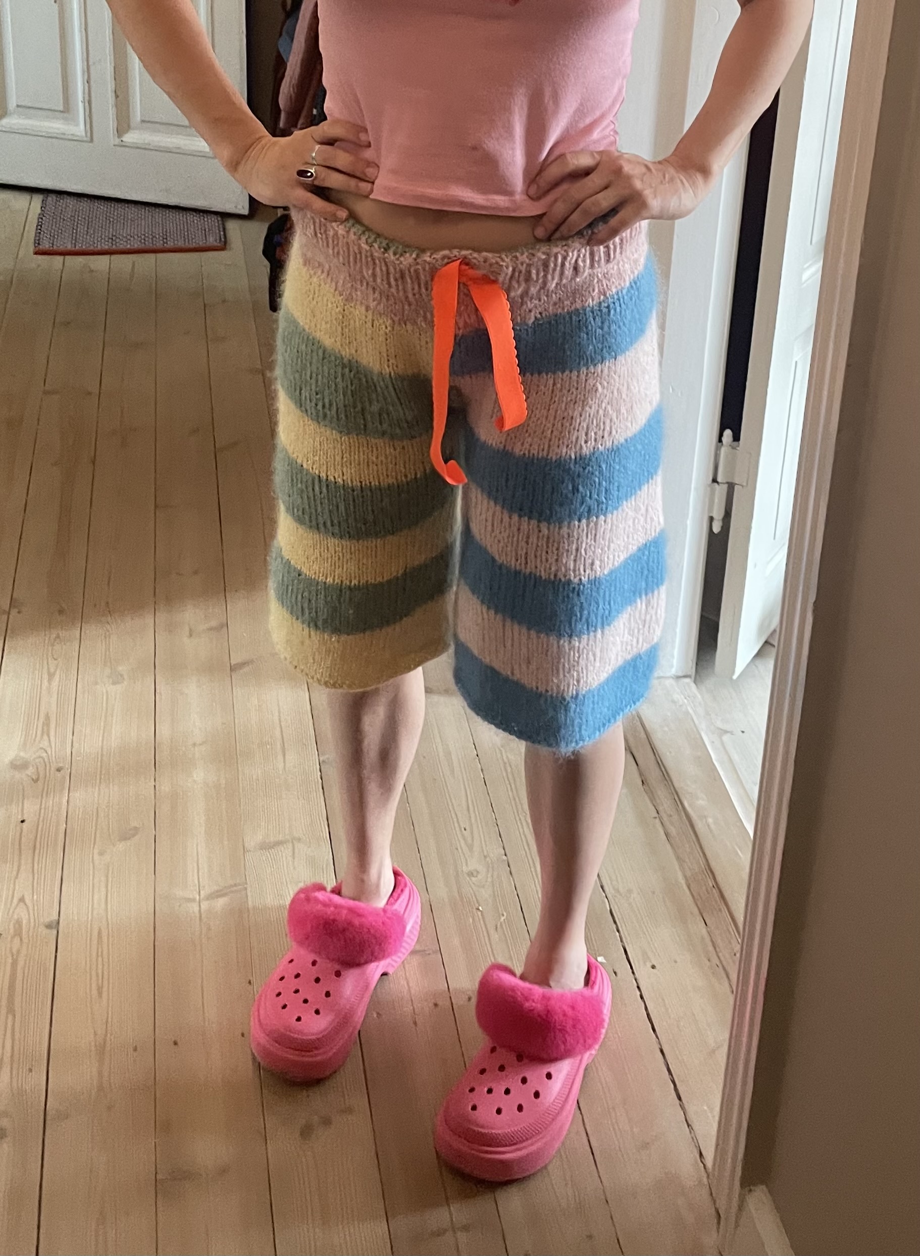 Her er et par shorts i farver og striber, der kan have lige den længde af bukseben, du ønsker. Eller det kan blive til lange bukser, hvis du fortsætter med at strikke! Shortsene er strikket med en løbegang i livet til en i-cord-snøre eller et bånd i en cool kontrastfarve.