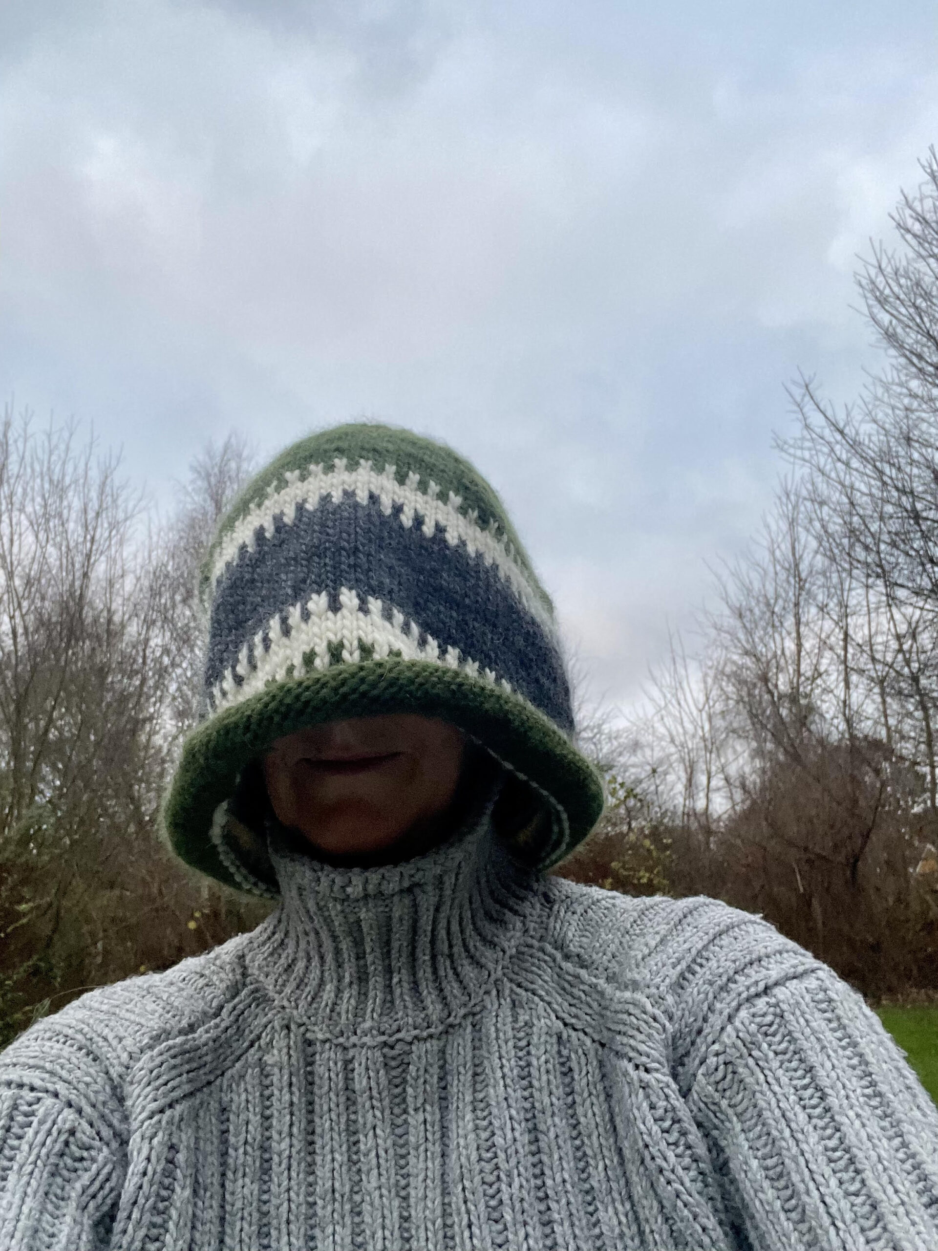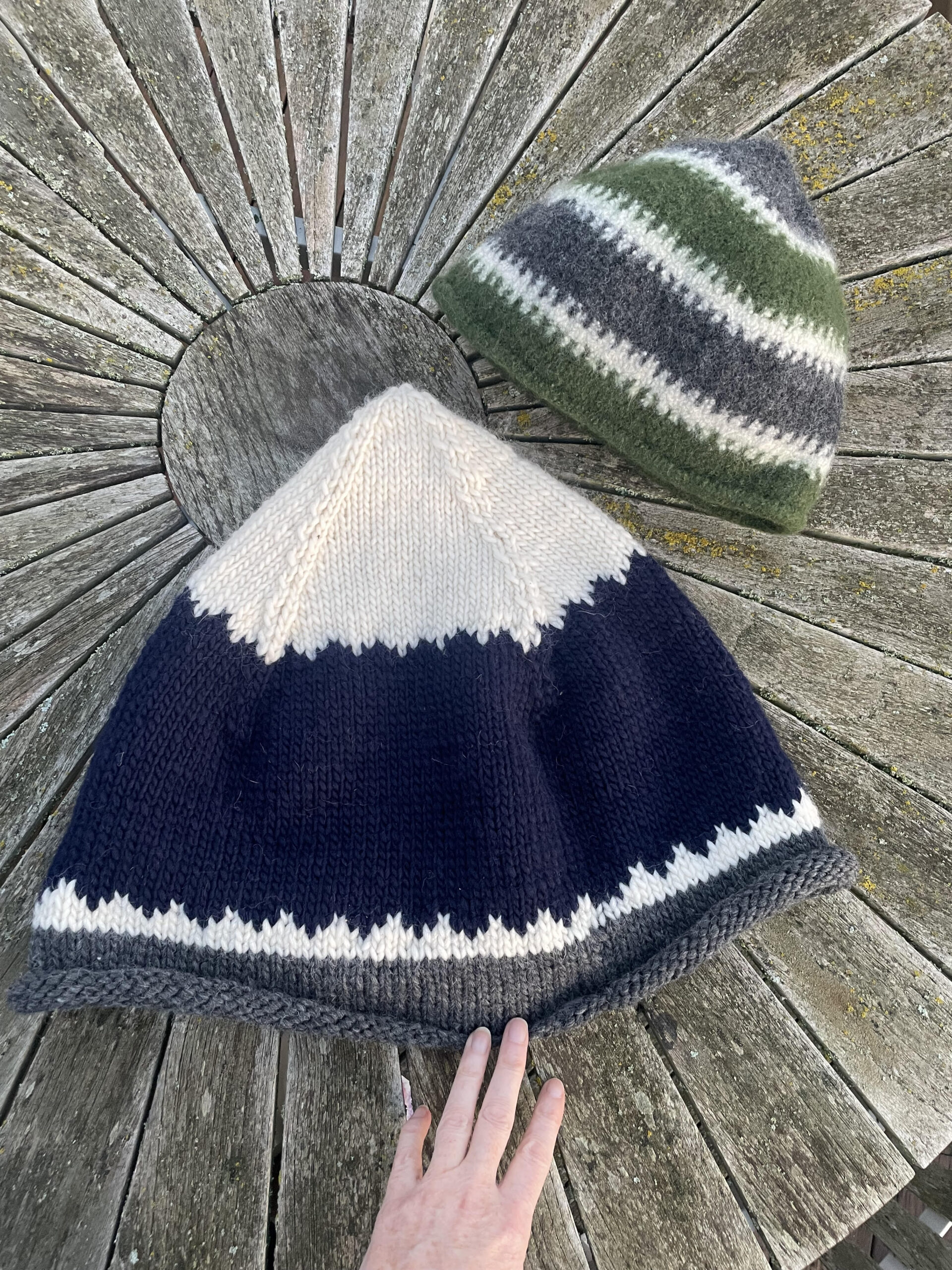 Huen strikkes nedefra og op. Bemærk, at huen er kæmpestor og løst strikket, men det ændrer sig i filteprocessen. Nogle gange skal huen vaskes to gange for at opnå det ønskede resultat. Hvis du vælger at strikke mønsterstrik på din hue, så vær opmærksom på de mange indtagninger.